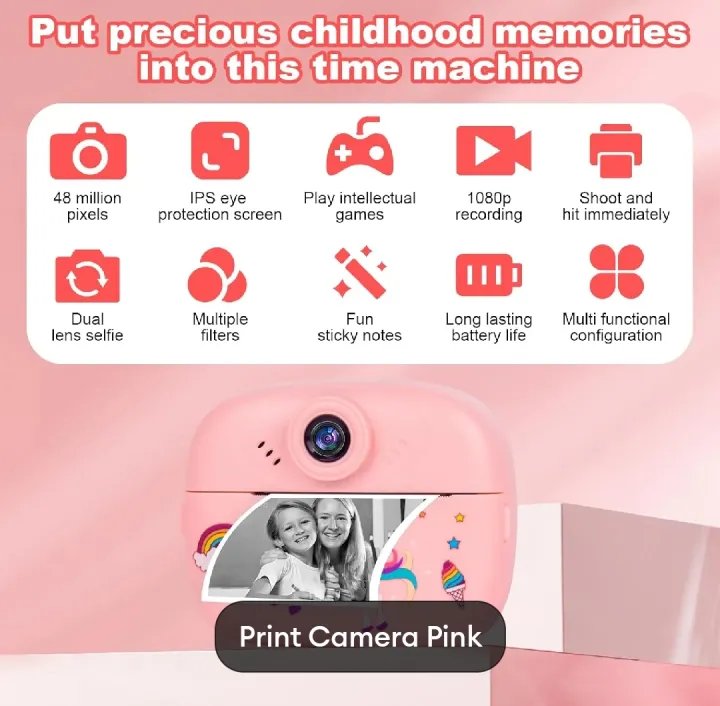 This instant print camera combines photography, video recording, and entertainment in one compact device. It helps children explore creativity, capture memories, and enjoy instant prints, making it a perfect all-in-one gift for kids.