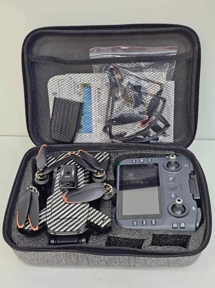 Drone, Remote Controller (with screen), Battery, Charging Cable, Extra Blades, Propeller Guards, Toolkit